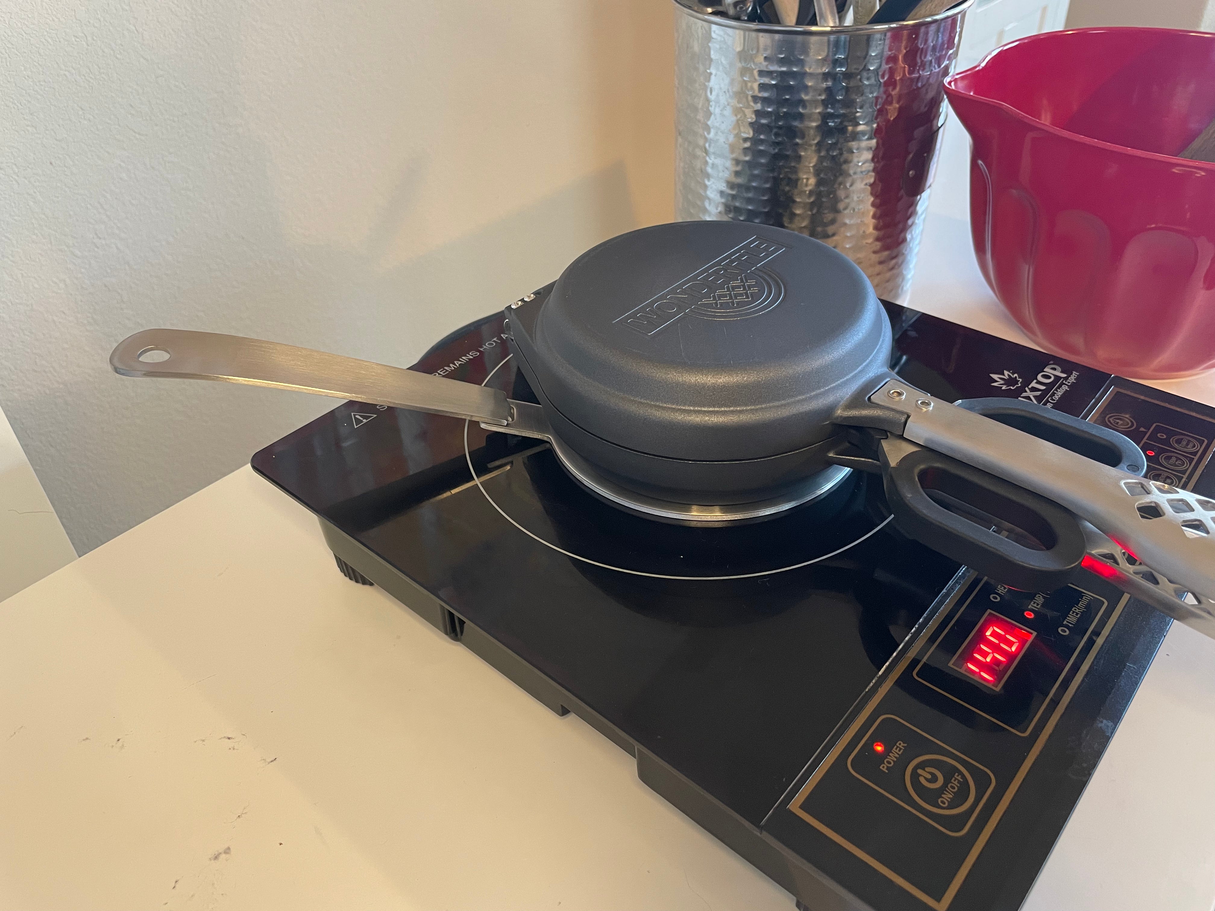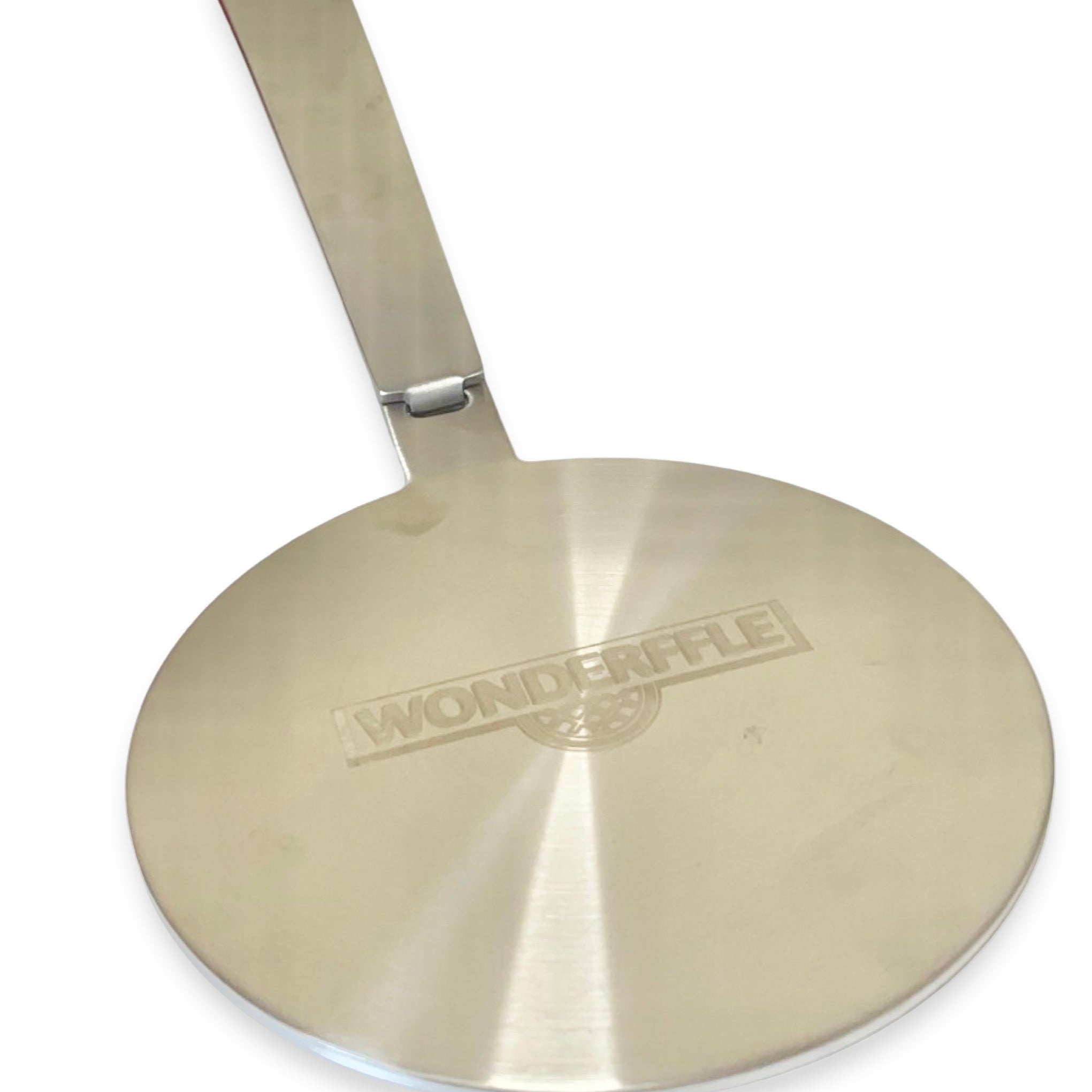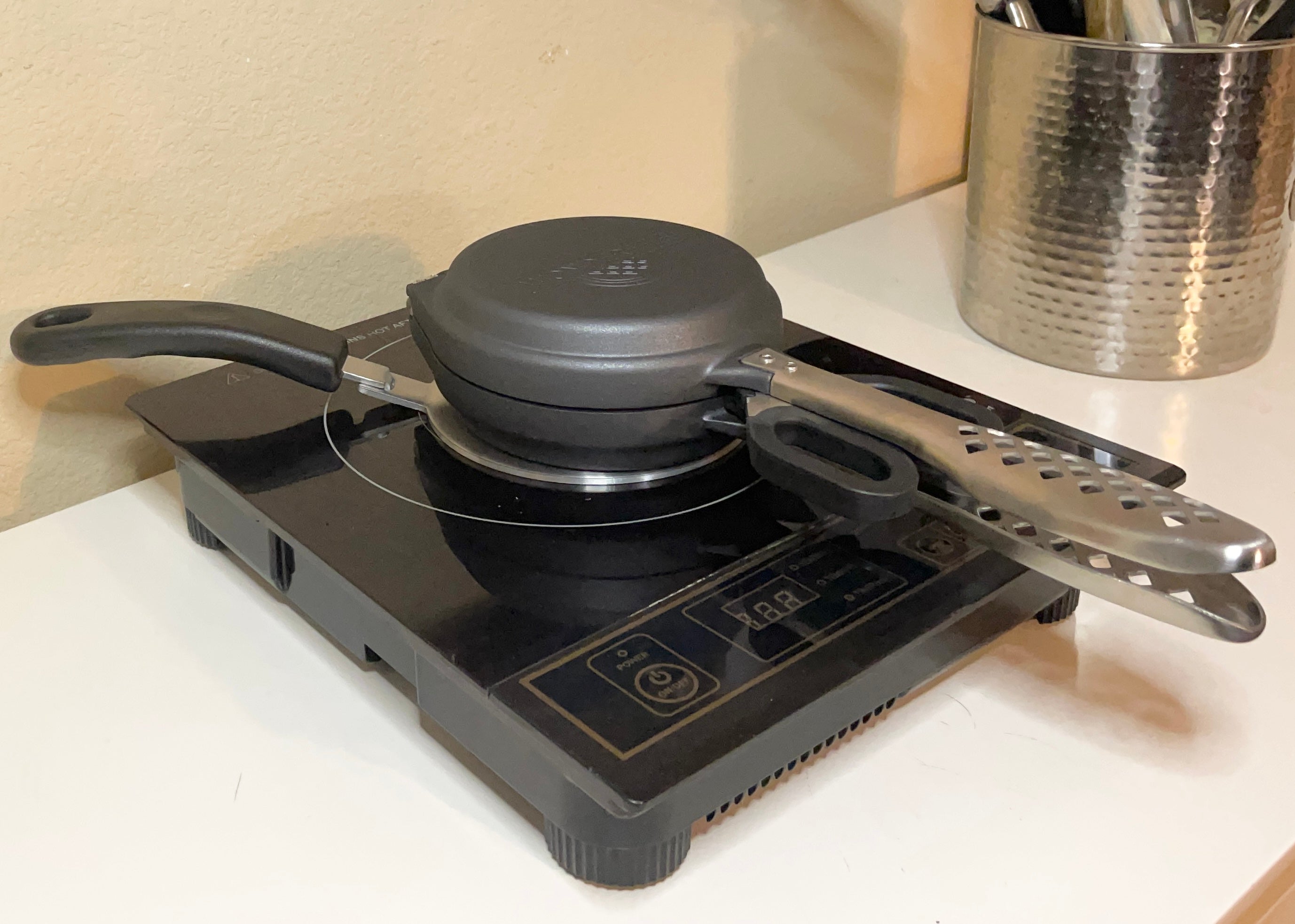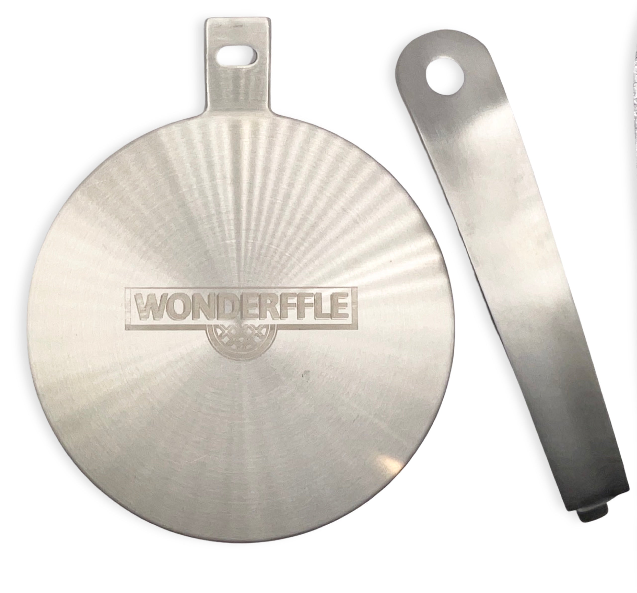 The stainless steel Adapter Plate allows The Stuffed Waffle Iron to cook on induction cooktops.